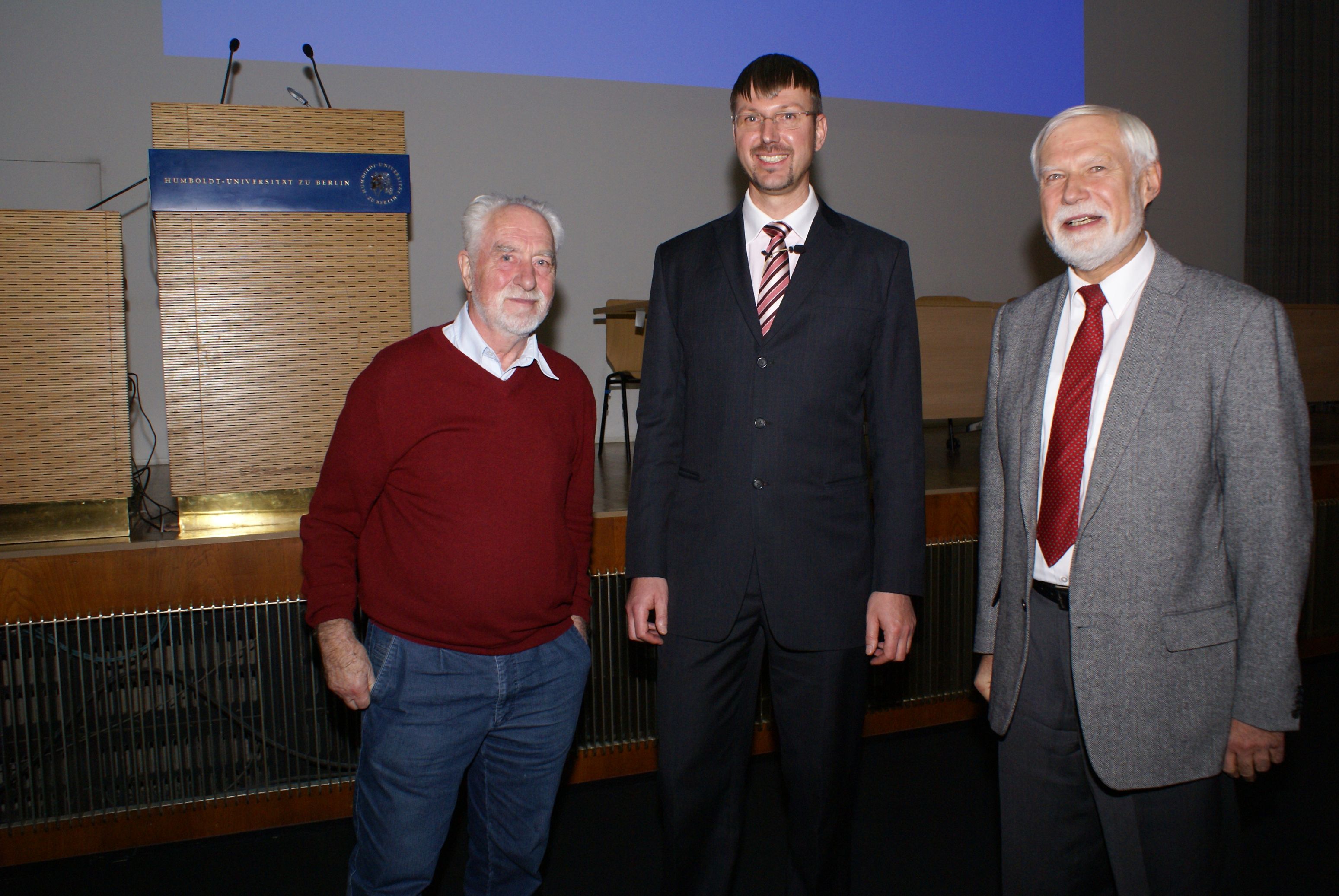 Prof. Helbing (mitte) zusammen mit Prof. Dr. Werner Ebeling (links), Humboldt-Universität zu Berlin, und Prof. Müller-Preußker (rechts) nach dem Vortrag. |