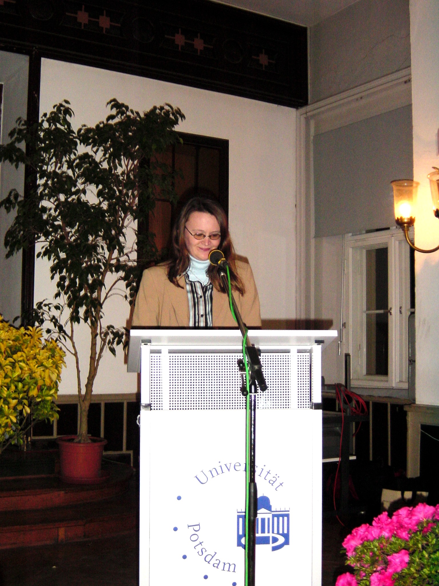 Ilka Bischofs-Pfeifer erhält einen Blumenstrauß von Prof. Dr.  Jürgen Rode, Vizepräsident für Forschung und wissenschaftlichen Nachwuchs der Universität Potsdam. |