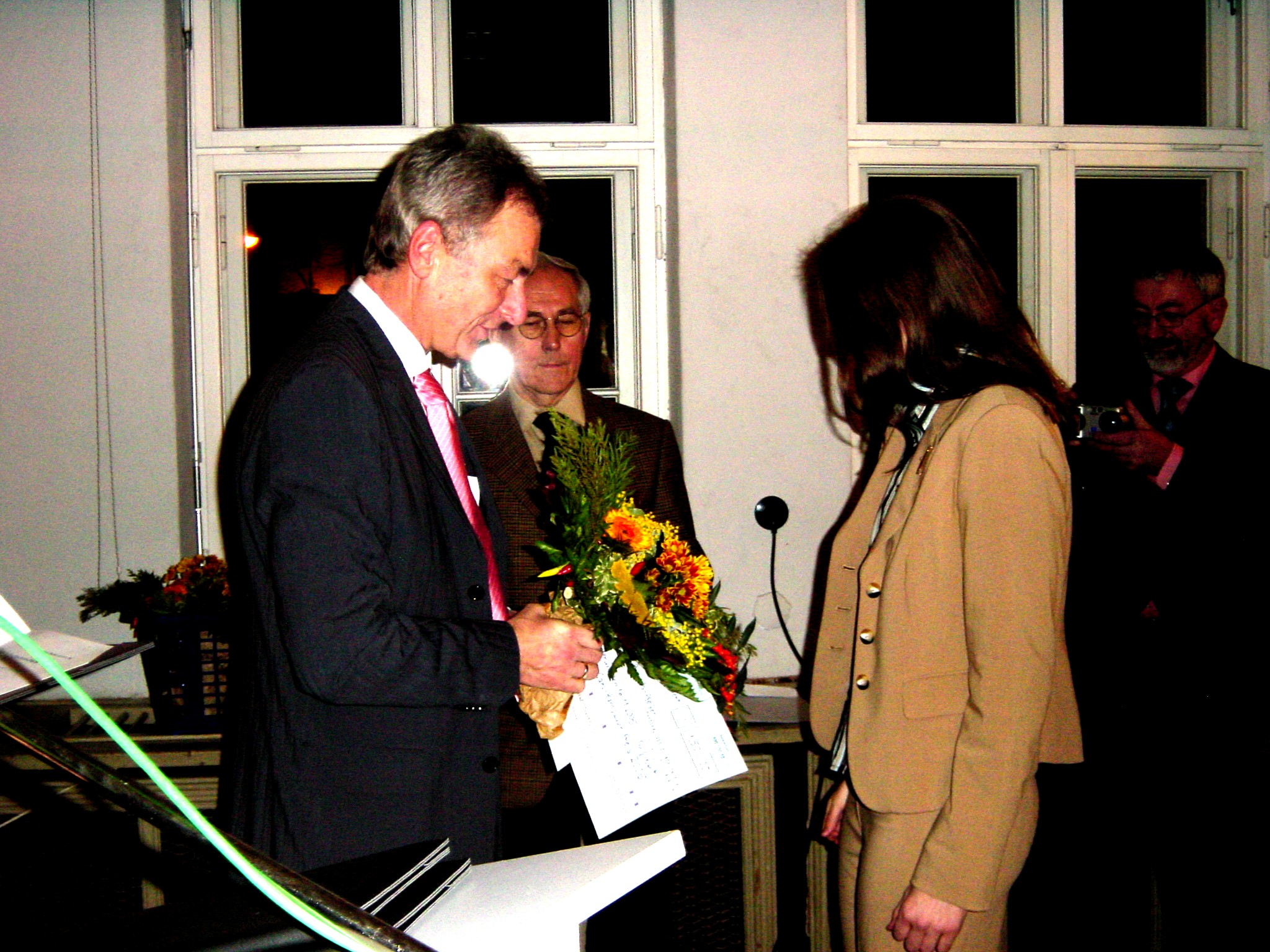 Helmut Lippert erhält einen Blumentrauß von  Prof. Dr.  Jürgen Rode, Vizepräsident für Forschung und wissenschaftlichen Nachwuchs der Universität Potsdam. |