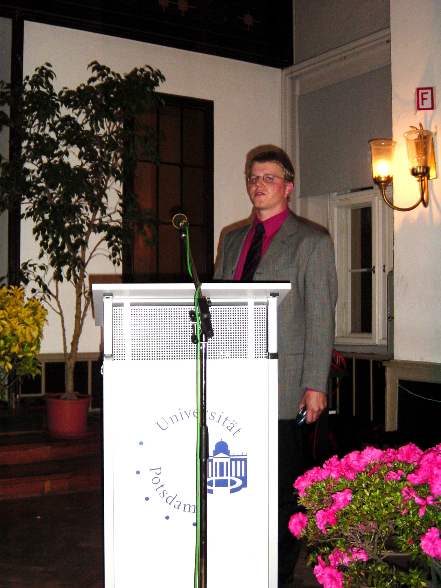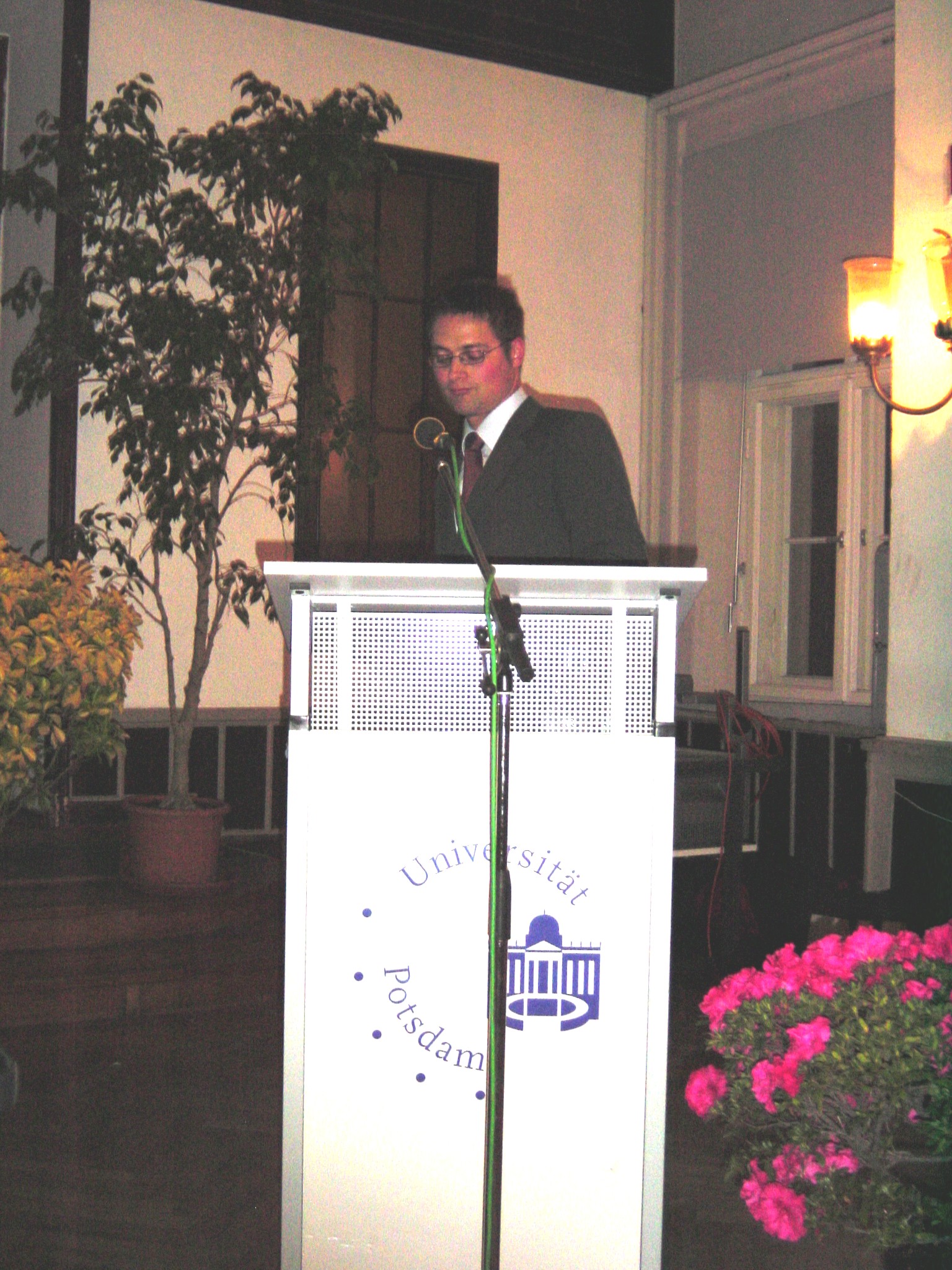 Jens Förstner erhält einen Blumenstrauß von Prof. Dr.  Jürgen Rode, Vizepräsident für Forschung und wissenschaftlichen Nachwuchs der Universität Potsdam. |