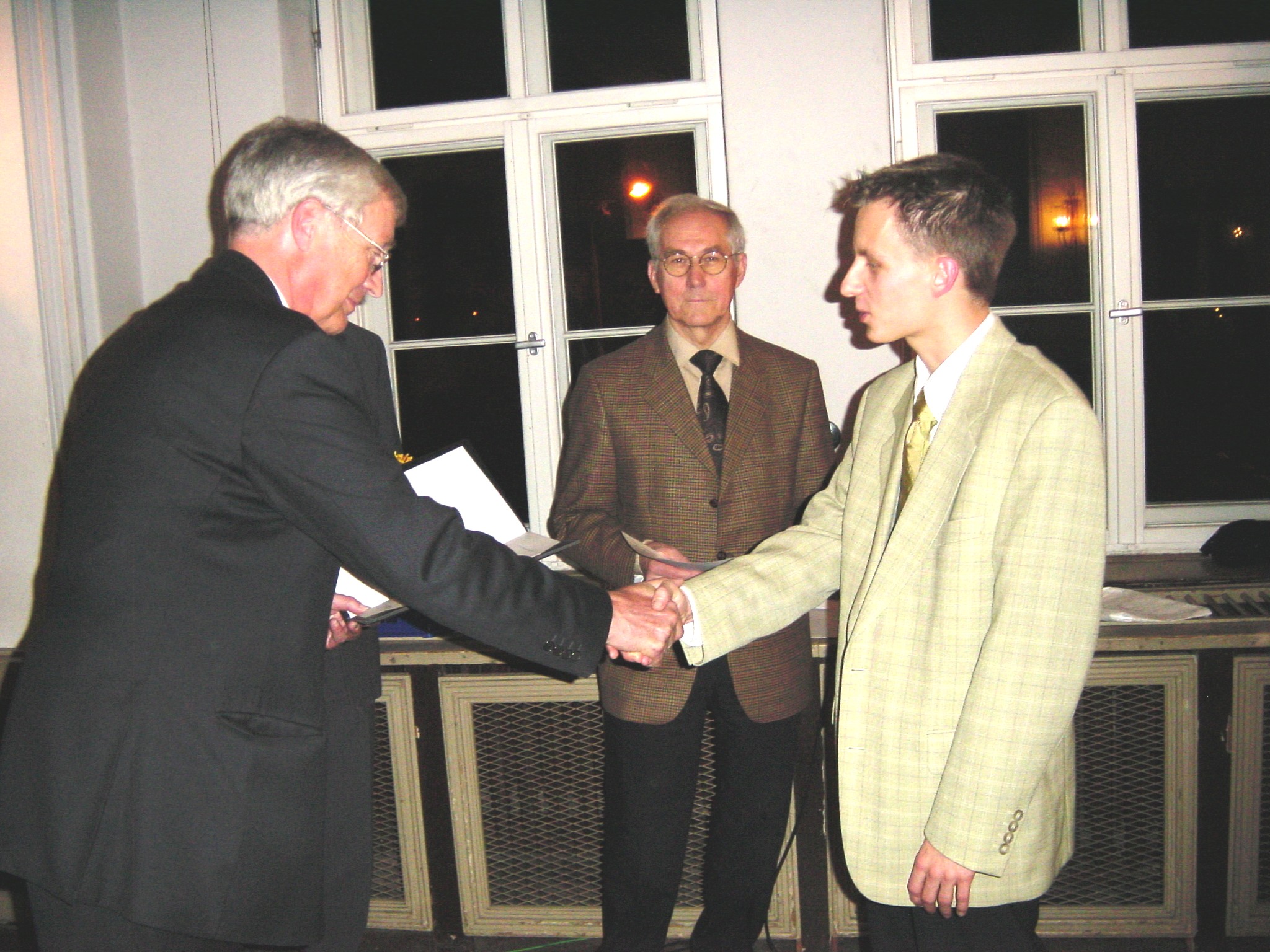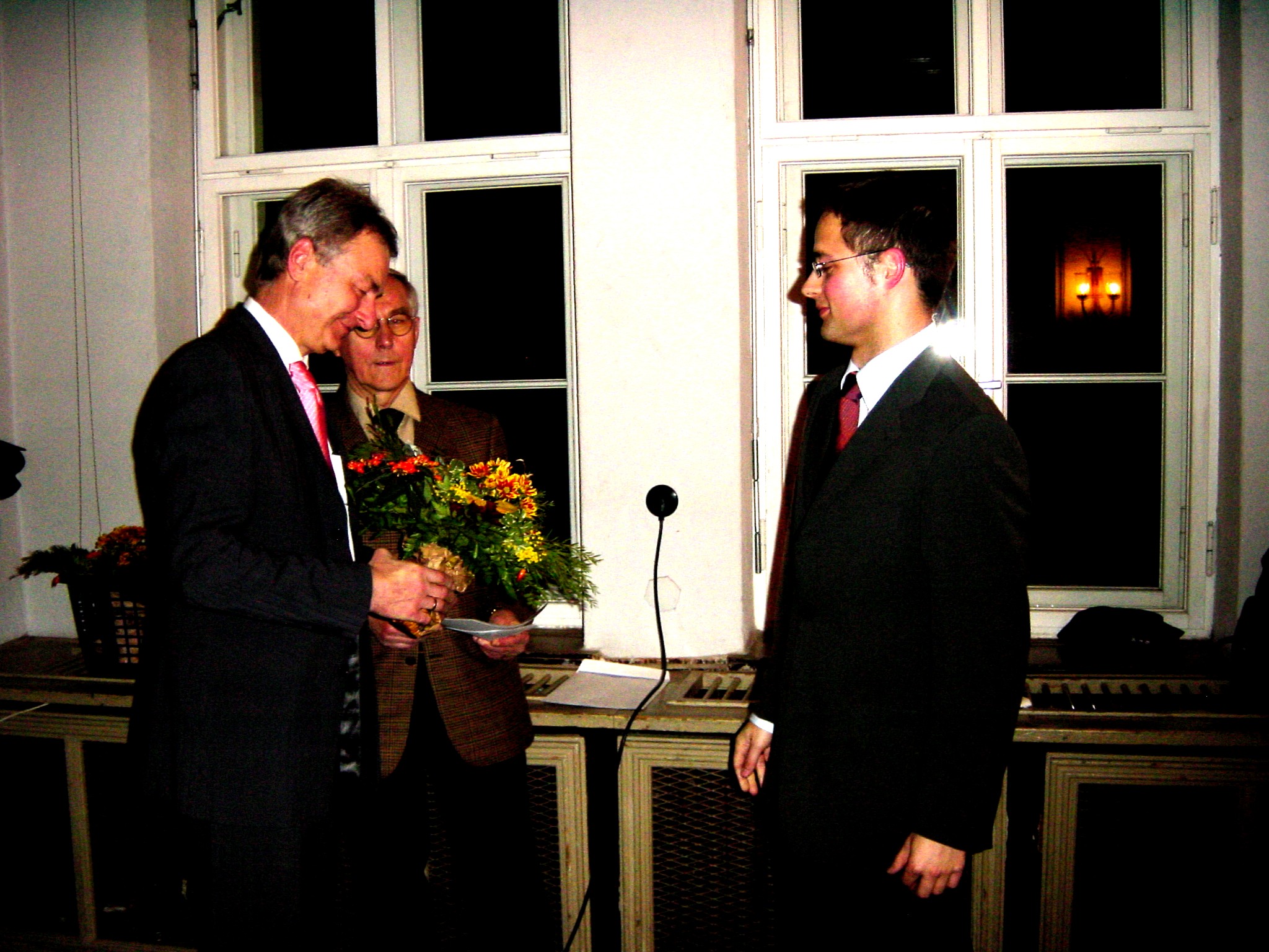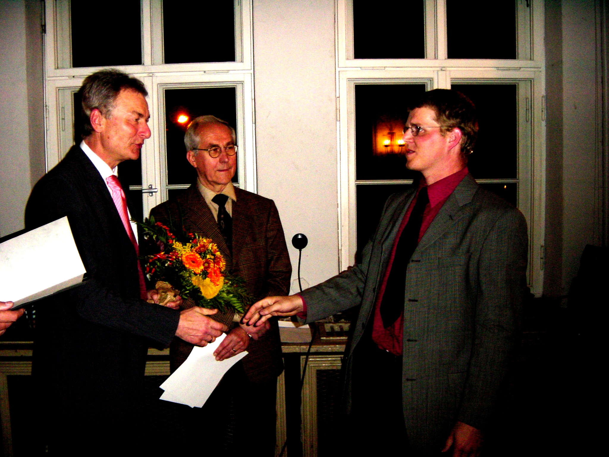| Frank Jäckel erhält die Urkunde für den Carl-Ramsauer-Preis 2005 vom Vorsitzenden der Physikalischen Gesellschaft zu Berlin (PGzB), Prof. Dr. Eberhard Jaeschke. |