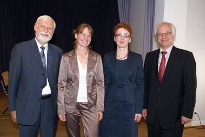 Die Preisträgerin, Priv.-Doz. Dr. Kathy Lüdge (2. v. l.), mit dem Vorsitzenden der PGzB, Prof. Dr. Michael Müller-Preußker (links), Frau Prof. Dr. Sabine Klapp (2. v. r.) von der Technischen Universität Berlin und dem stellvertretenden Vorsitzenden der PGzB, Dr. Wolfang Buck (rechts), nach der Verleihung des Karl-Scheel-Preises am 22. Juni 2012.