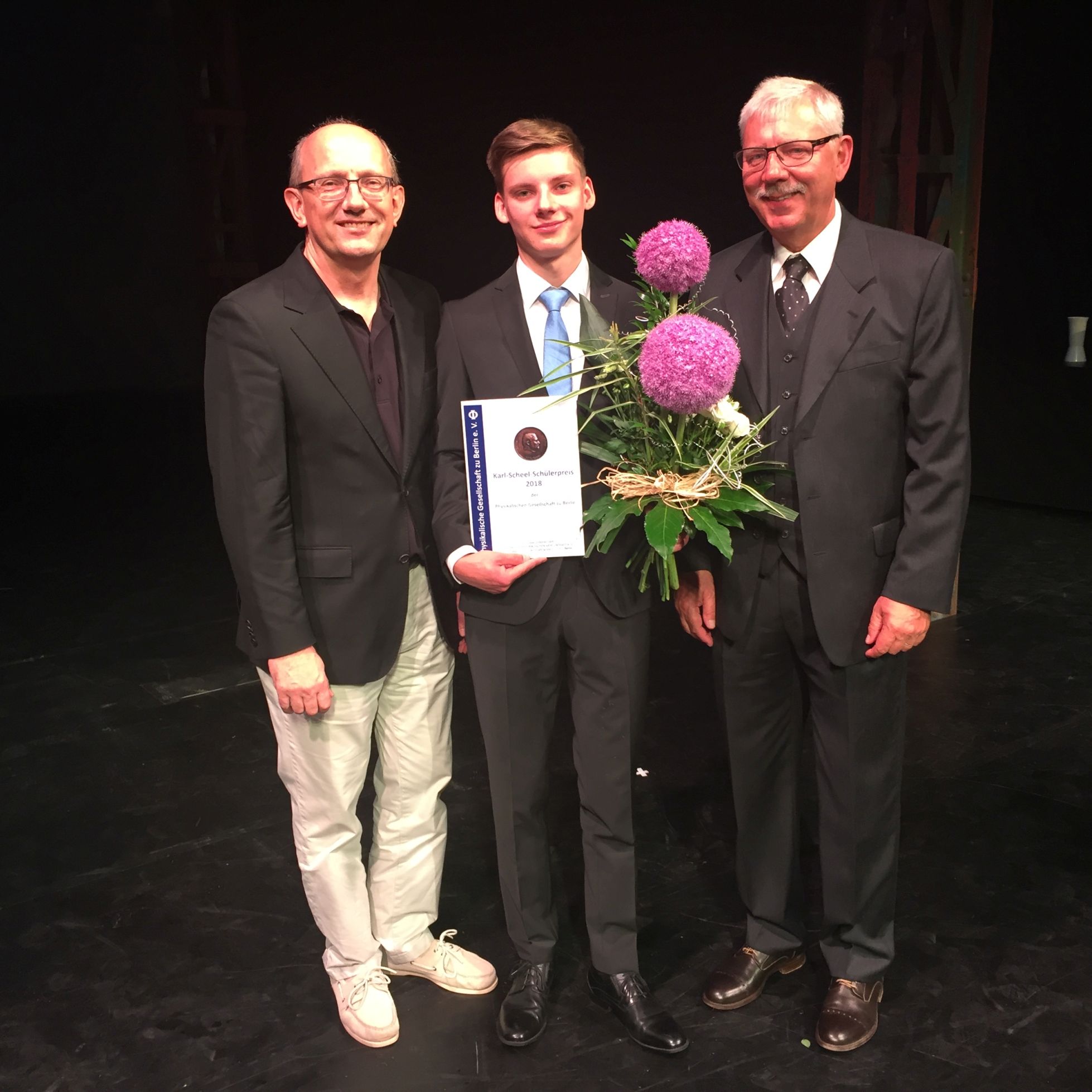 Herr Tomas Kreißel (Mitte), der Träger des Karl-Scheel-Schülerpreises 2018, vom Innerstädtischen Gymnasium Rostock zusammen mit Herrn Prof. Dr. Martin Wolf (links), dem Vorsitzenden der PGzB, und dem Physiklehrer Herrn Helmut Lawrenz (rechts), aufgenommen am 30. Juni 2018 in Rostock.