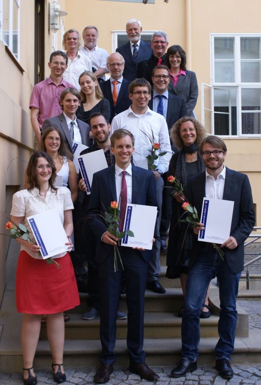 Die Preisträgerinnen und Preisträger 2014 zusammen mit ihren Betreuerinnen und Betreuern, dem Festredner, R. Schlögl (hintere Reihe, 3. v. links), den Vertretern der Siemens AG, A. Grasse (hintere Reihe, rechts) und Dr. Thomas Grandke (hintere Reihe, 2. v. links), sowie der Vorsitzenden der PGzB, U. Woggon (hintere Reihe, mitte), und dem Stellvertretenden Vorsitzenden der PGzB, Prof. Dr. Michael Müller-Preußker (hintere Reihe, 3. v. rechts). |