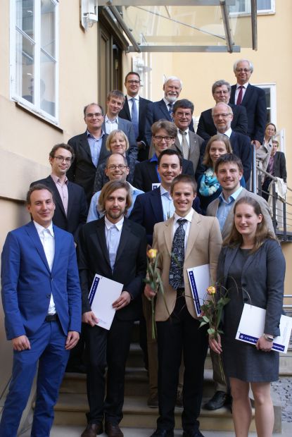 Die Preisträgerin und die Preisträger 2013 zusammen mit ihren Betreuerinnen und Betreuern sowie Dr. Thomas Grandke (1. Reihe, 2.v.l.), Siemens AG (Corporate Technology, Vice President), Adrian Grasse (2. Reihe, links), Siemens AG (Corporate Communications and Government Affairs, Head Office Berlin), Prof. Dr. Michael Müller-Preußker (1. Reihe, rechts), Vorsitzender der Physikalischen Gesellschaft zu Berlin (PGzB), und Dr. Wolfgang Buck (1. Reihe, links), Stellvertretender Vorsitzender der PGzB. |