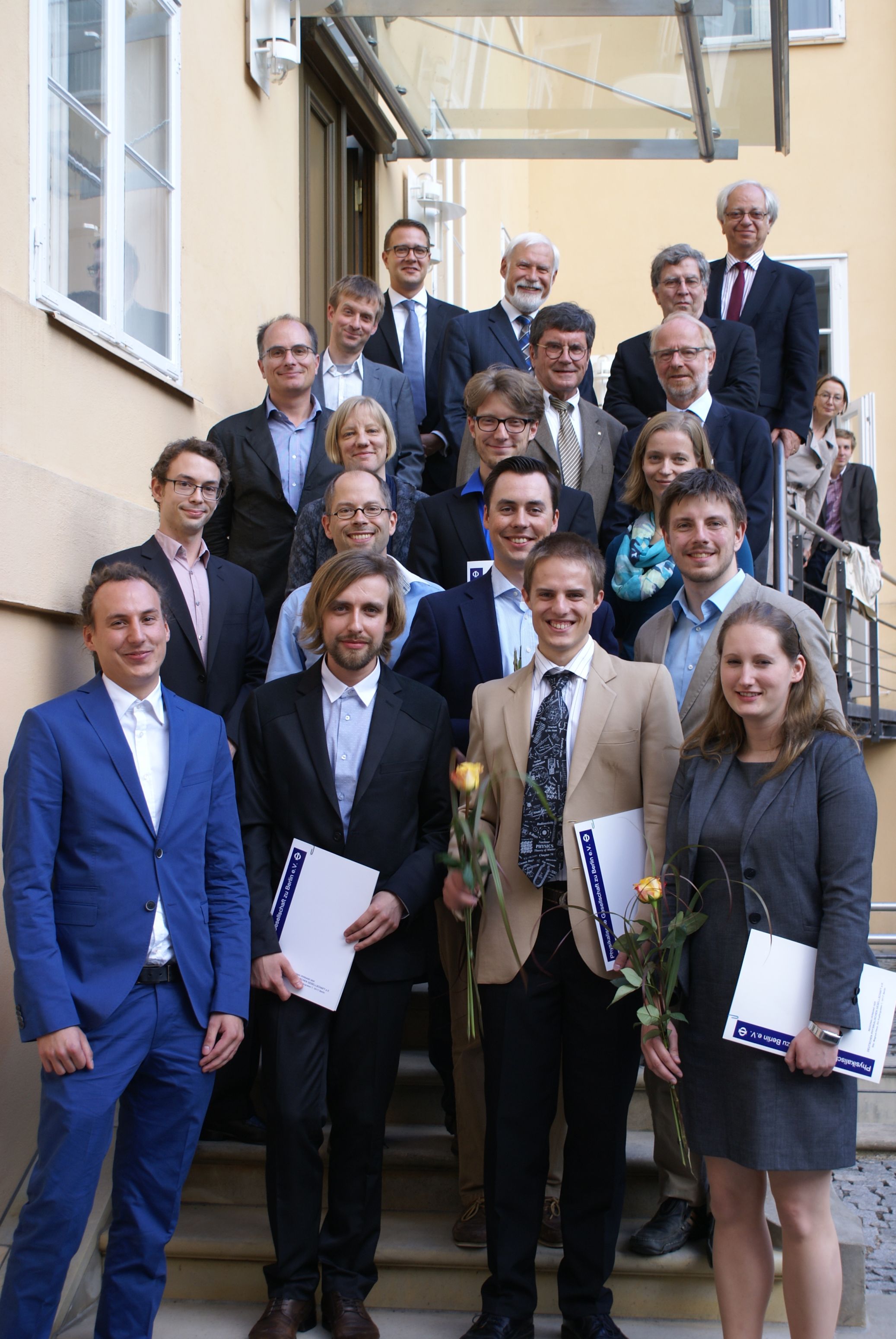 Gruppenfoto mit der Preisträgerin und den Preisträgern, den Betreuerinnen und Betreuern, den Vertretern der Siemens AG, Prof. Dr. Wolfgang Sandner, Vizepräsident der Deutschen Physikalischen Gesellschaft, und dem Vorsitzenden und Stellvertr. Vorsitzenden der PGzB im Hof des Magnus-Hauses. |