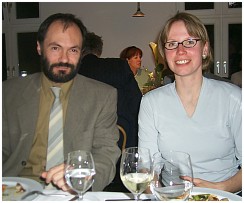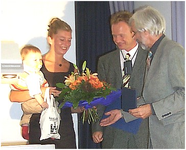 Der Vorsitzende der Physikalischen Gesellschaft zu Berlin, Klaus Baberschke gratuliert der Familie Netz und übergibt Preis, Scheel-Medaille und Blumen. |