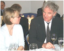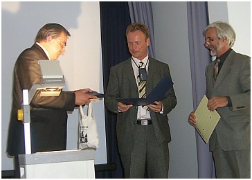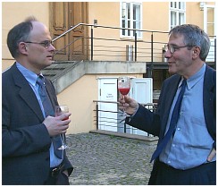 | Der Präsident der Deutschen Physikalischen Gesellschaft Dirk Bastin (rechts) im Gespräch mit dem Betreuer des Preisträgers Reinhard Lipowsky. |