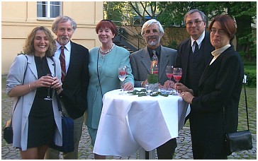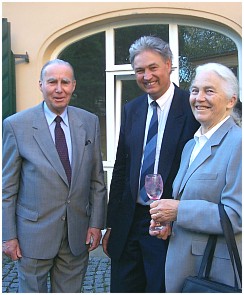 | ...vor der Remise des Magnus-Hauses(von links, der langjährige Schatzmeister der PGzB,Herr Nelkowski und der neue Schatzmeister, Herr Barthel, Frau Nelkowski) ... |