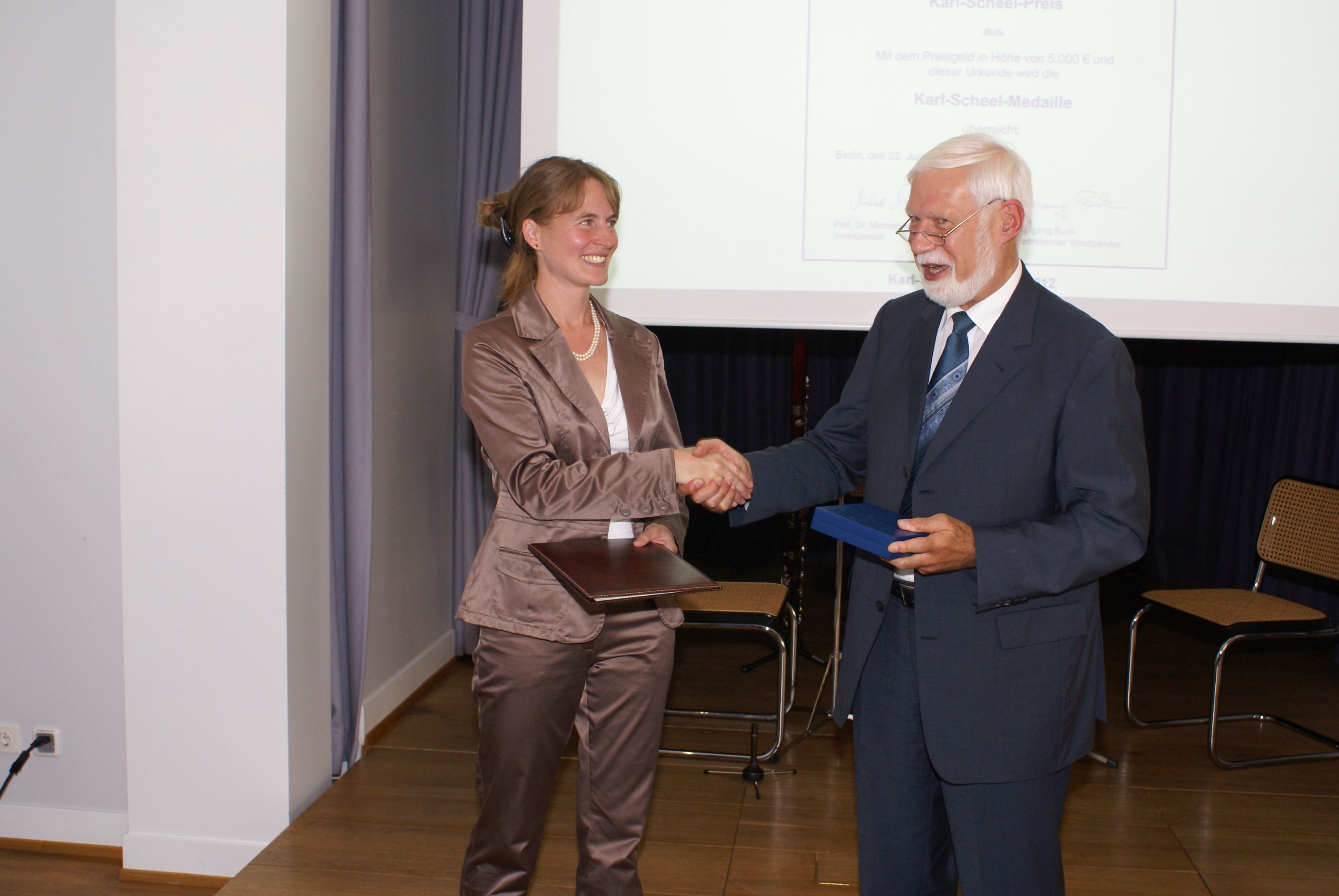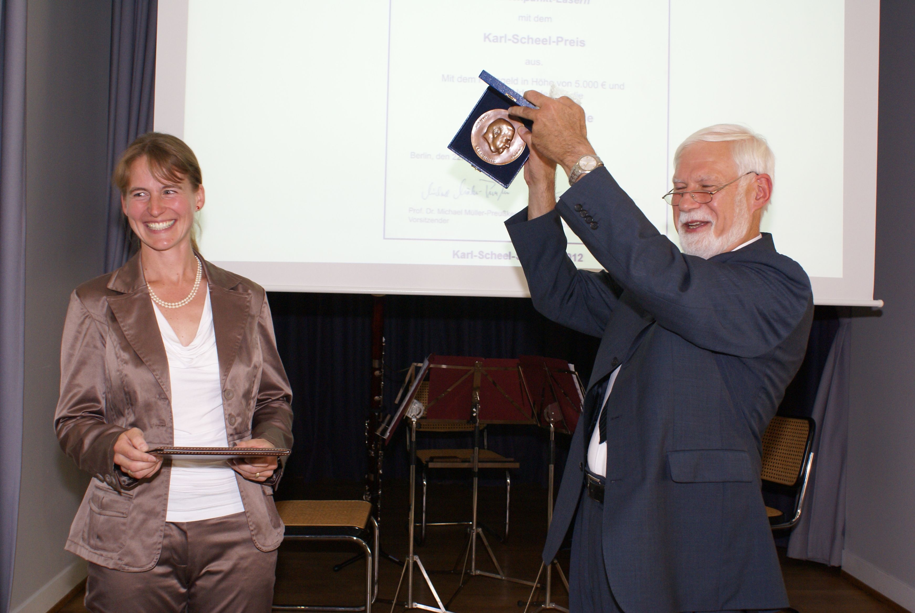Kathy Lüdge erhält die Urkunde für den Karl-Scheel-Preis 2012 vom Vorsitzenden der PGzB, Michael Müller-Preußker. |