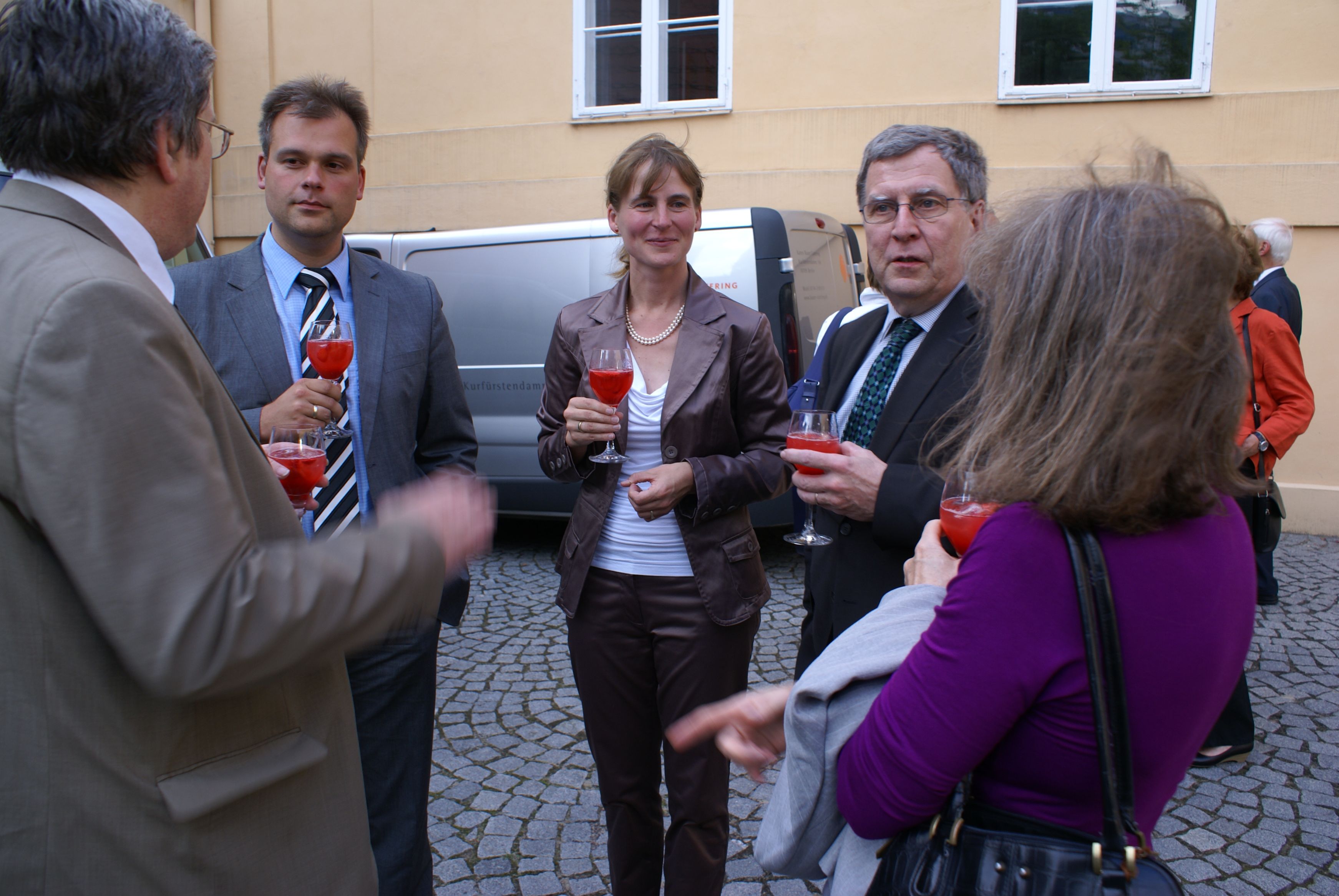 Die Preisträgerin (Mitte) und ihr Ehemann, Herr  Lüdge (2. v. l.), im Gespräch mit dem Präsidenten der Technischen Universität Berlin, Prof. Dr.-Ing. Jörg  Steinbach (links), und dem Vizepräsidenten der Deutschen Physikalischen Gesellschaft, Prof. Dr. Wolfgang Sandner (rechts).