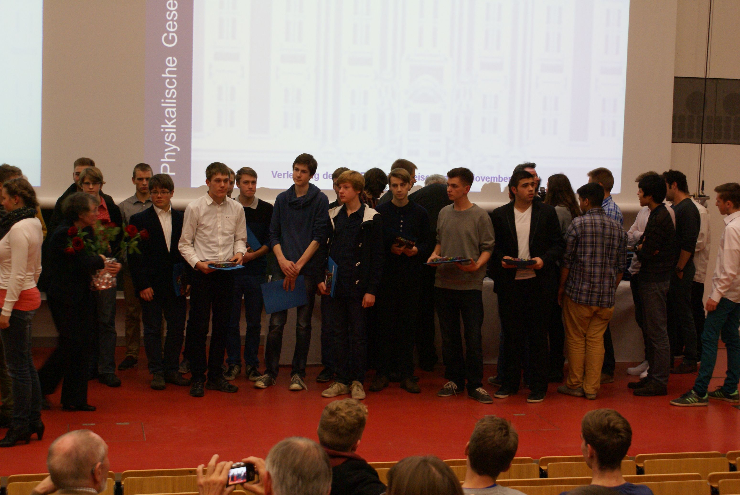 Die Preisverleihung beginnt mit der Übergabe der Urkunden, Buchpreise, DPG-Mitgliedschaften und Blumen (zum Vergrößern Bild anklicken). |