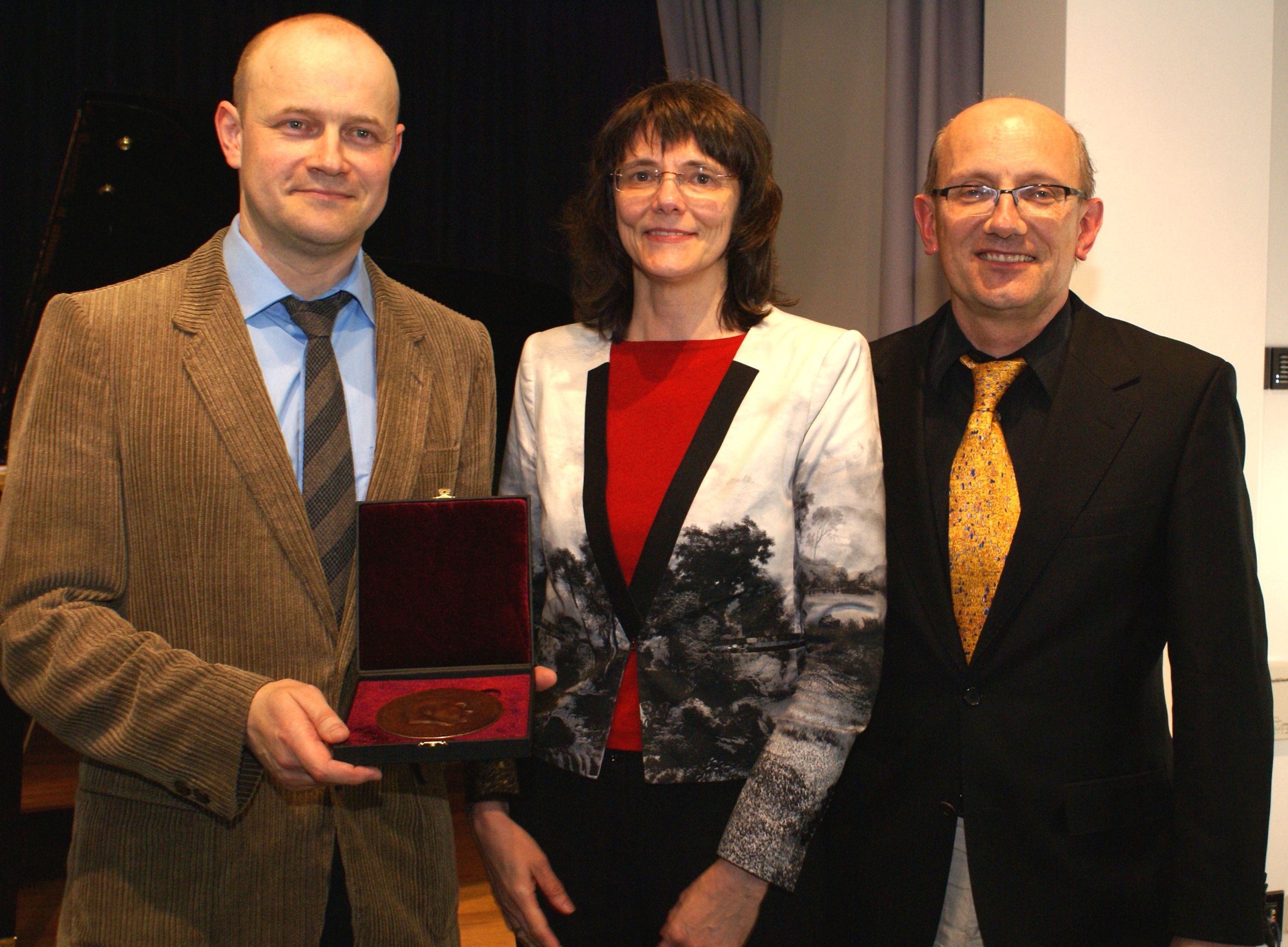 Der Preisträger, Dr. Tobias Kampfrath (links), mit der Vorsitzenden der PGzB, Prof. Dr. Ulrike Woggon (Mitte), und Herrn Prof. Dr. Martin Wolf (rechts) vom Fritz-Haber-Institut der Max-Planck-Gesellschaft in Berlin nach der Verleihung des Karl-Scheel-Preises am 27. Juni 2014.