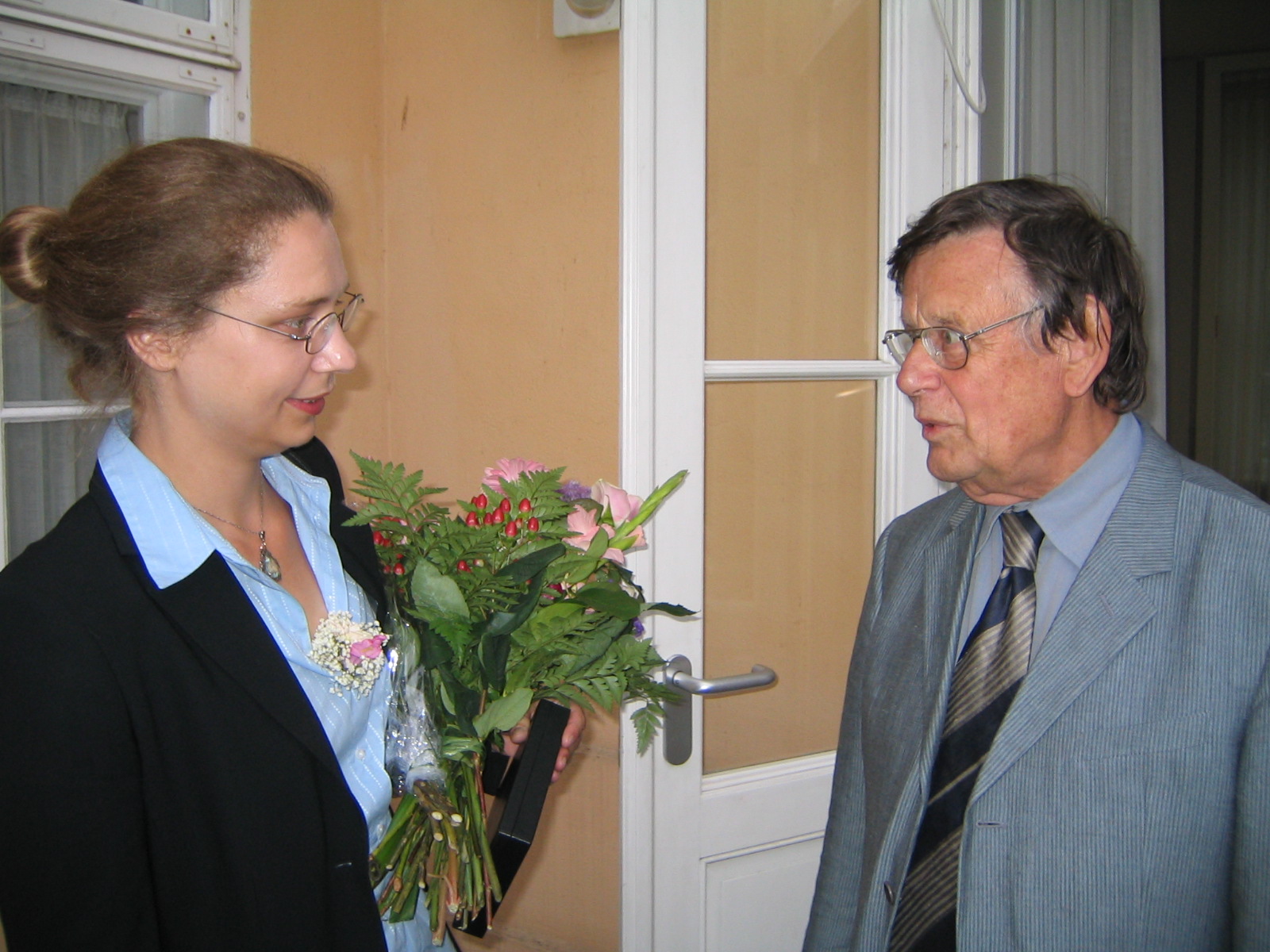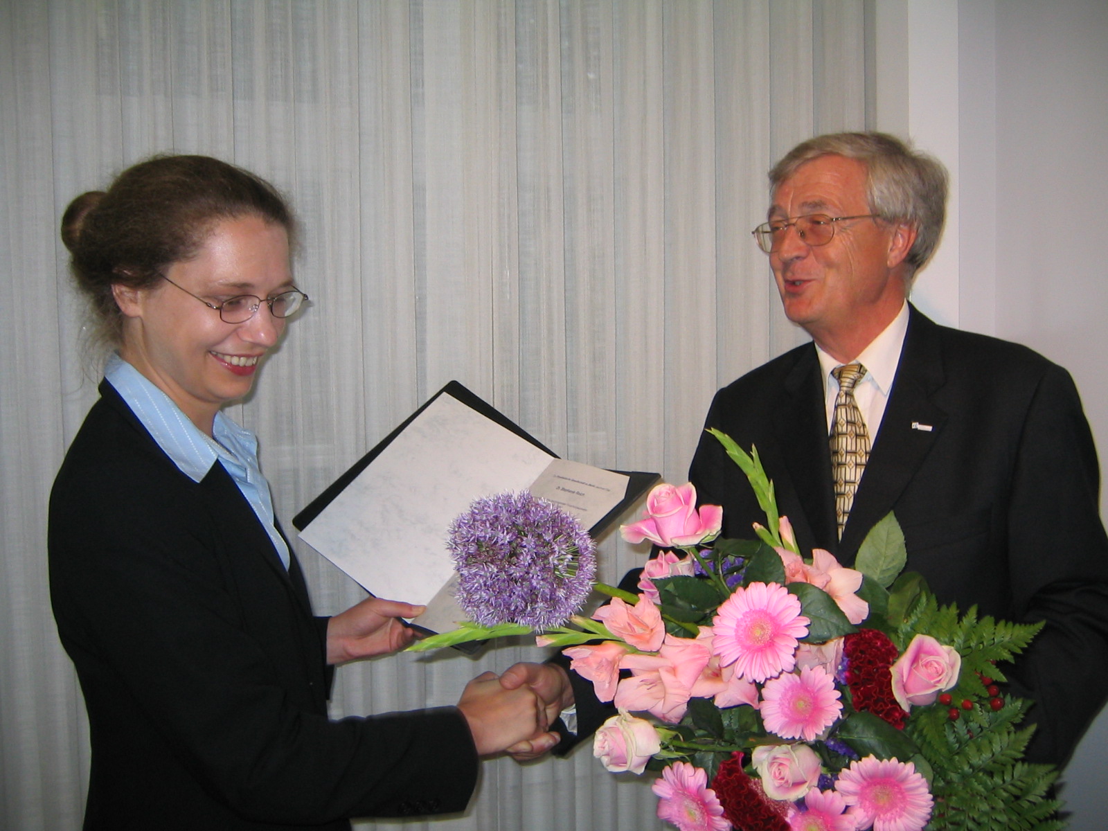 Die Karl-Scheel-Preisträgerin 2005, Dr. Stephanie Reich, erhält die Urkunde und einen Bluemnstrauß vom Vorsitzenden der Physikalischen Gesellschaft zu Berlin (PGzB), Prof. Dr. Eberhard Jaeschke.