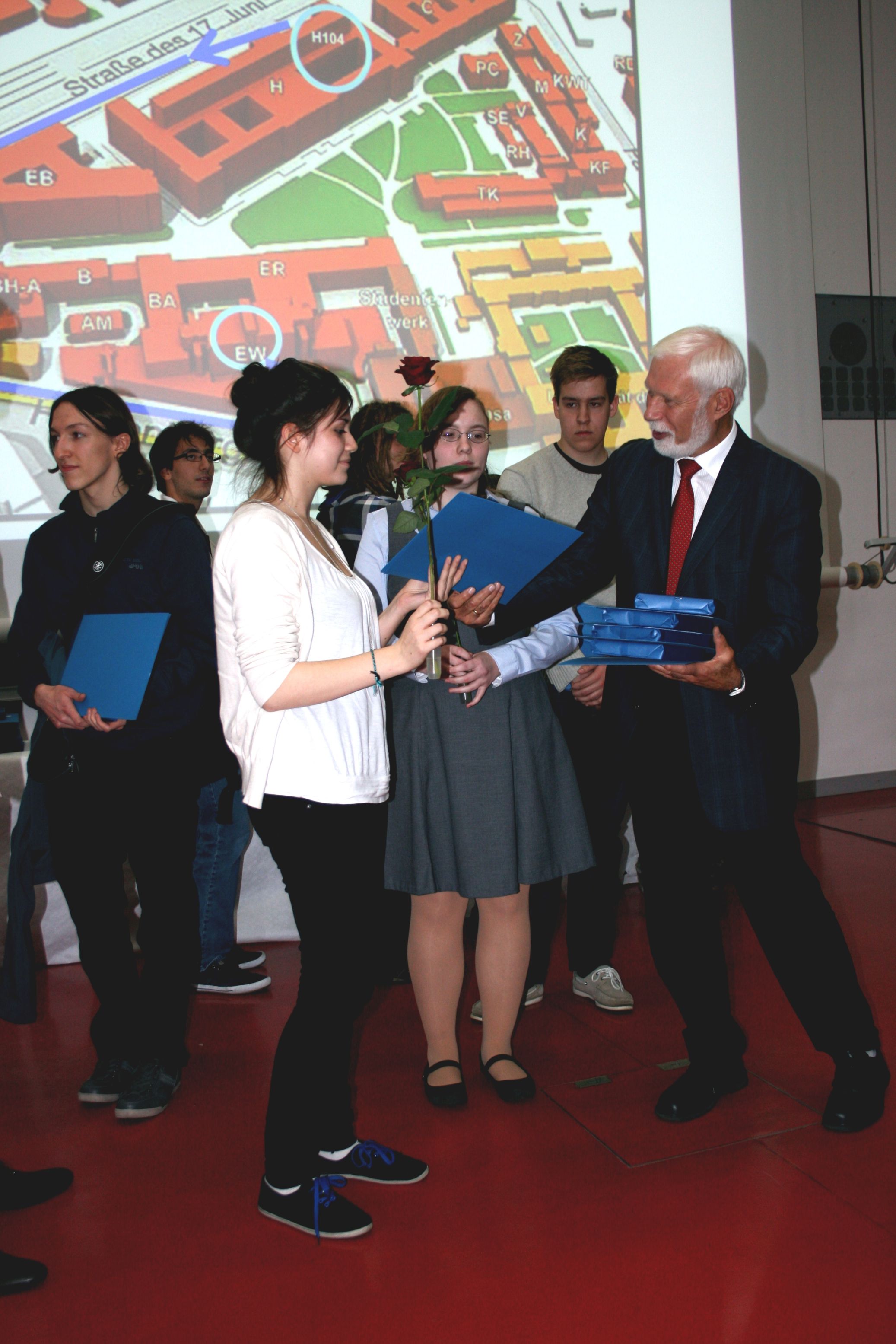 Der Vorsitzende der PGzB, Prof. Dr. Michael Müller-Preußker (rechts), übergibt einer Schülerin Urkunde, Buchpreis und Blume.