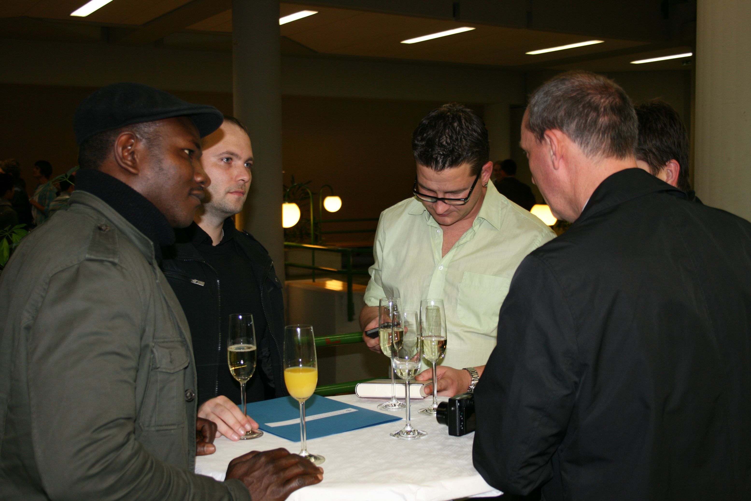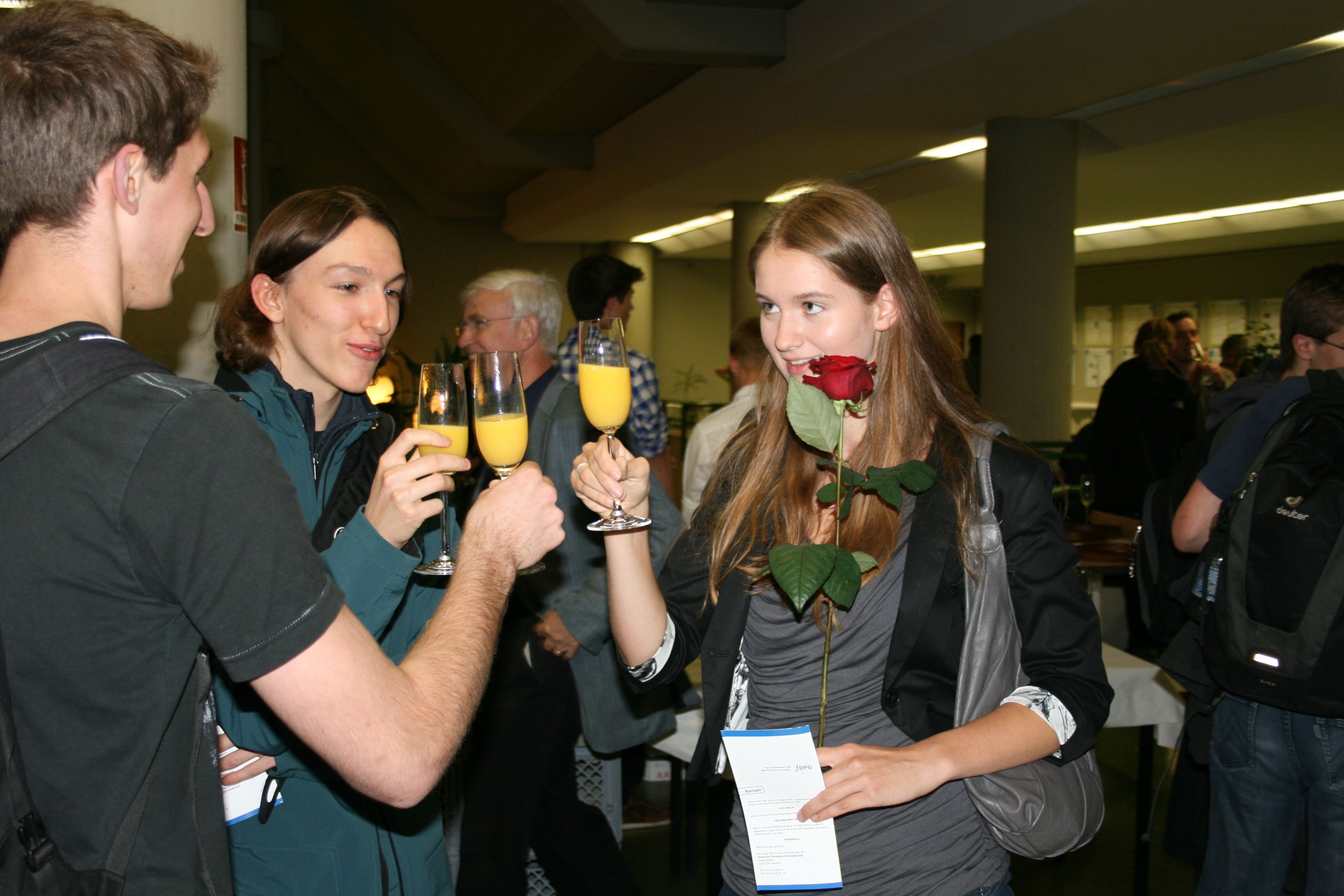 Die Preisträgerinnen und Preisträger prosten sich beim anschließendem Empfang gegenseitig zu. |