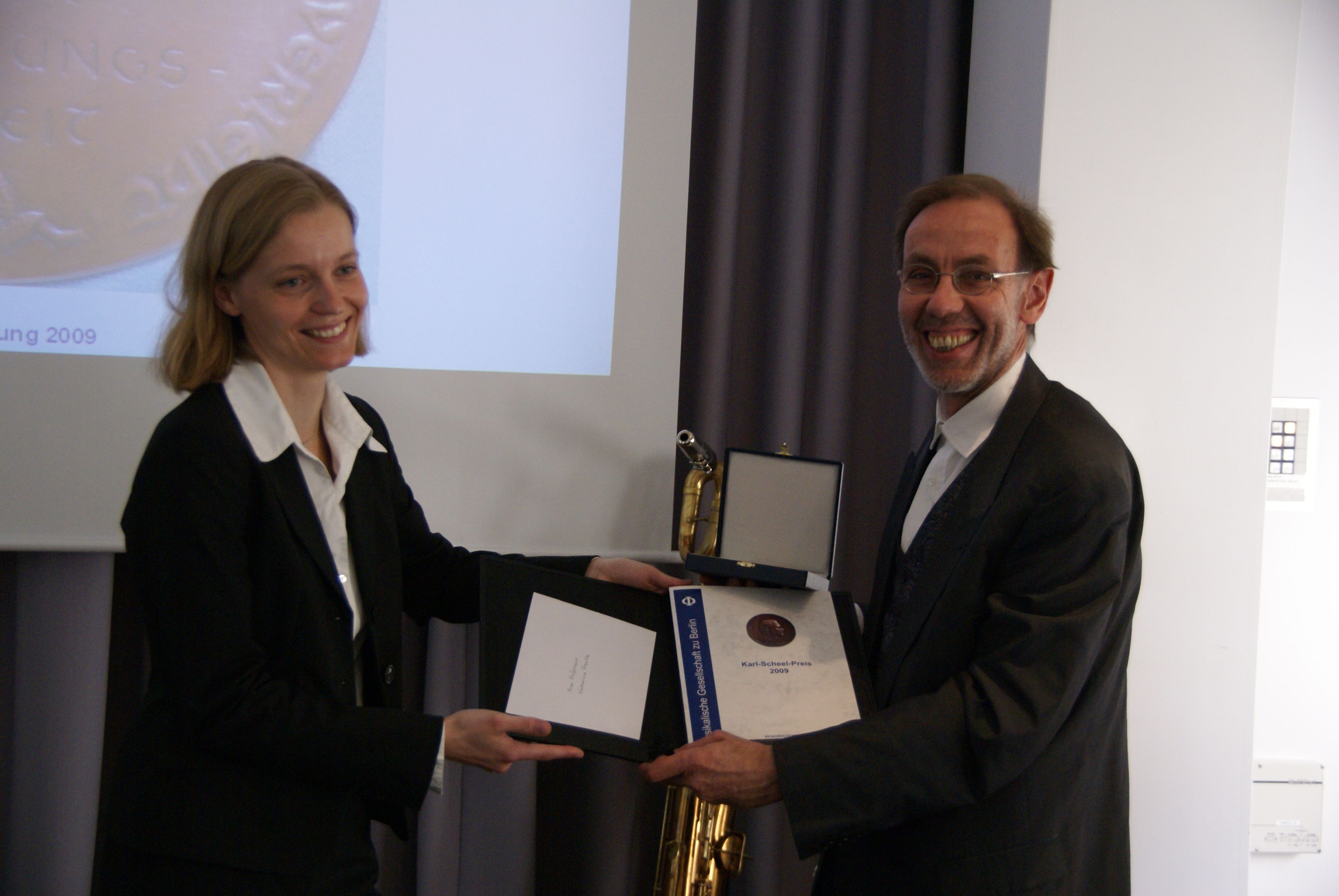 Katharina Franke erhält die Urkunde für den Karl-Scheel-Preis 2009 vom Vorsitzenden der Physikalischen Gesellschaft zu Berlin (PGzB), Prof. Dr. Martin Wilkens.