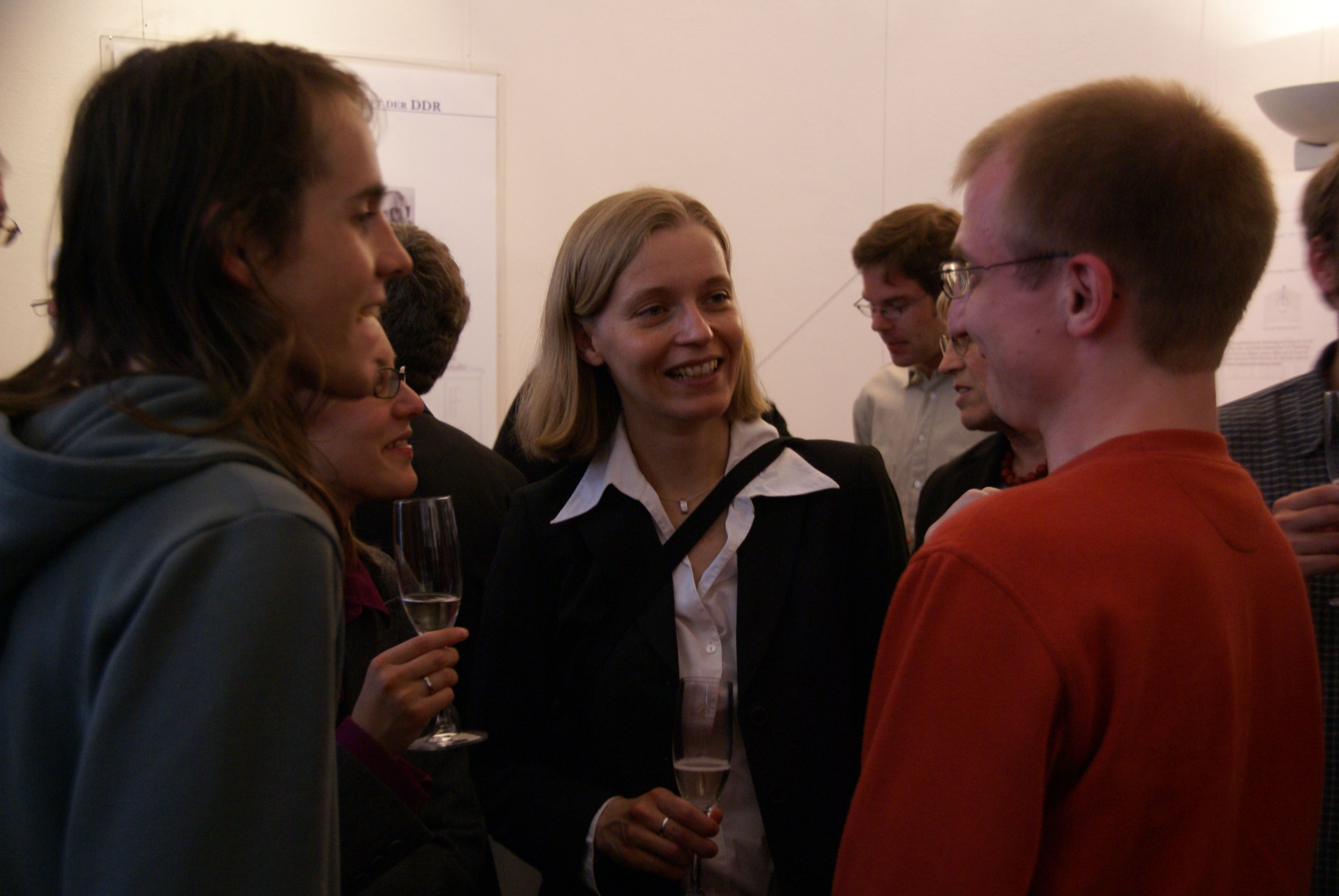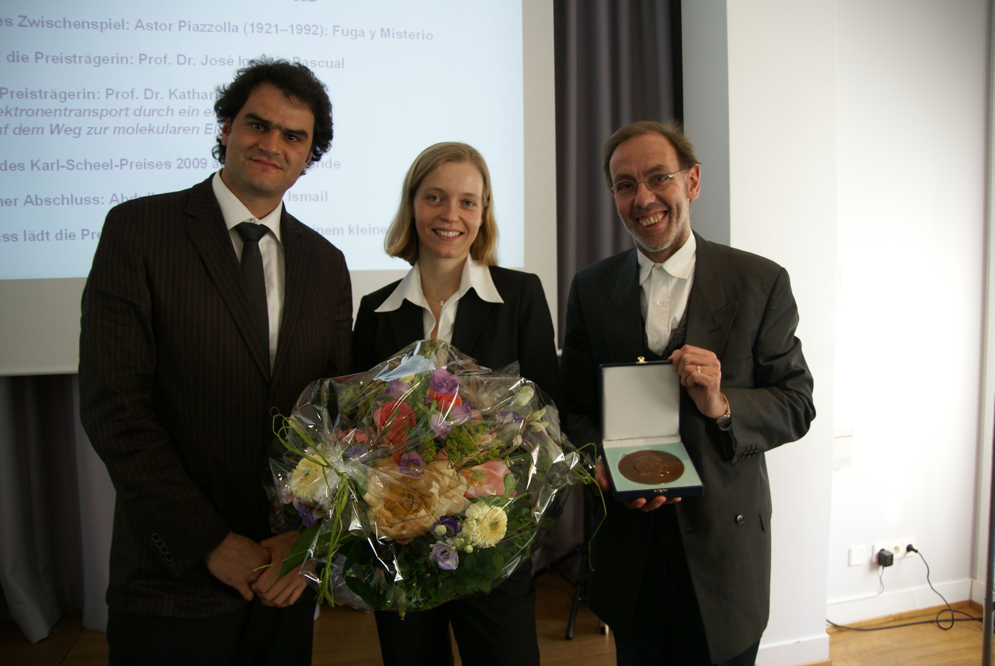 | Die Karl-Scheel-Preisträgerin 2009, K. Franke (Mitte), mit dem Laudator, J. I. Pascual (links), und dem Vorsitzenden der PGzB, M. Wilkens (rechts). |