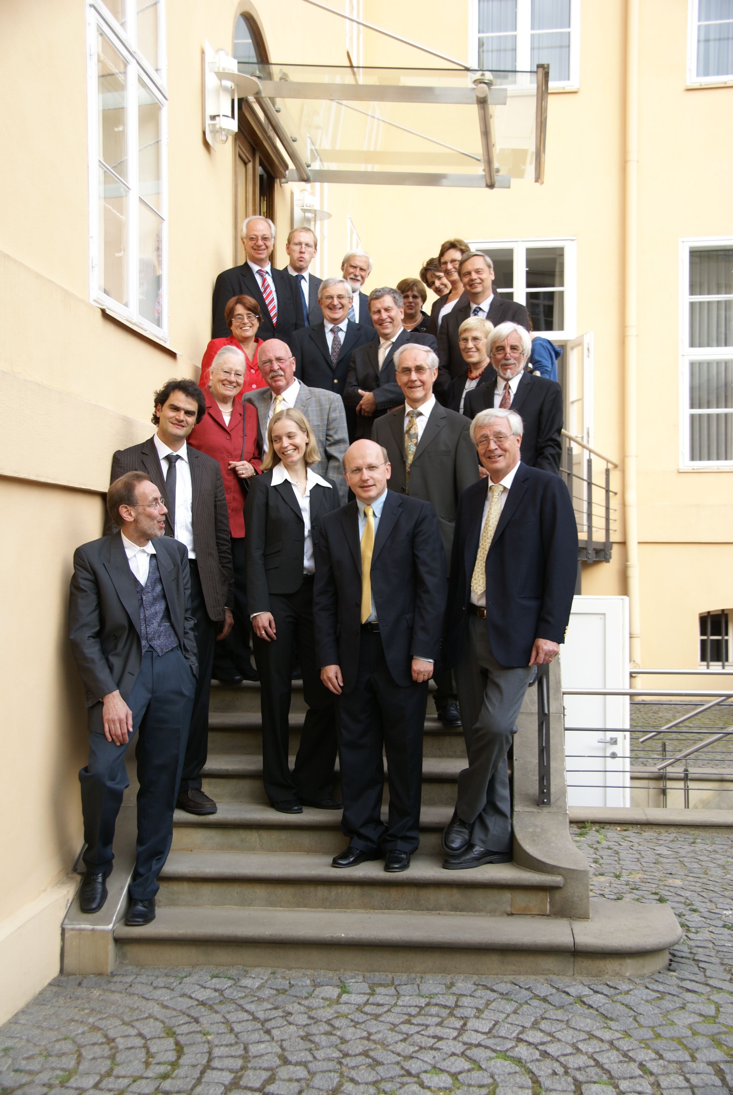 Gruppenfoto mit der Preisträgerin auf der Treppe im Hof des Magnus-Hauses.