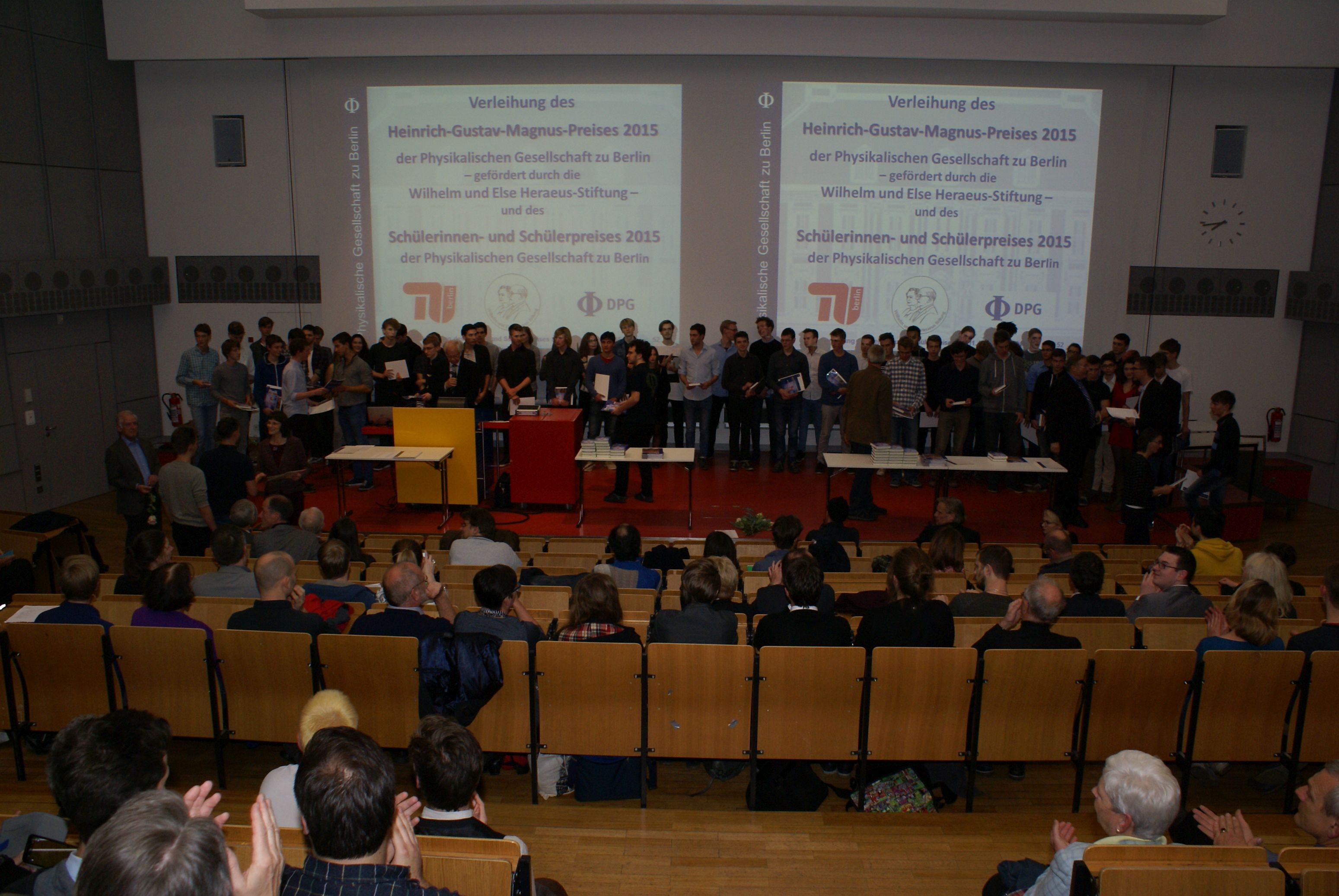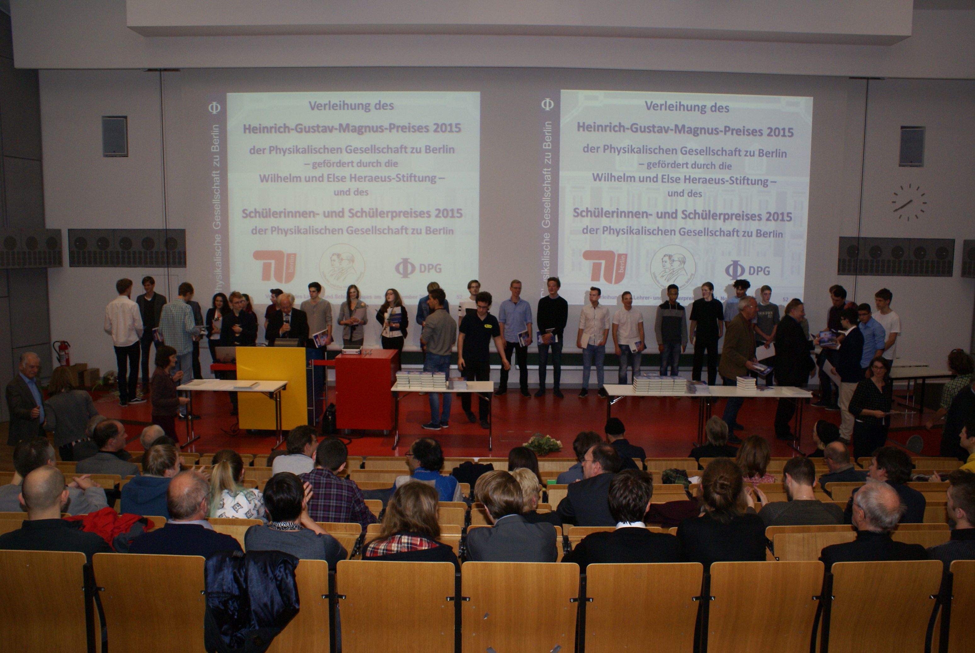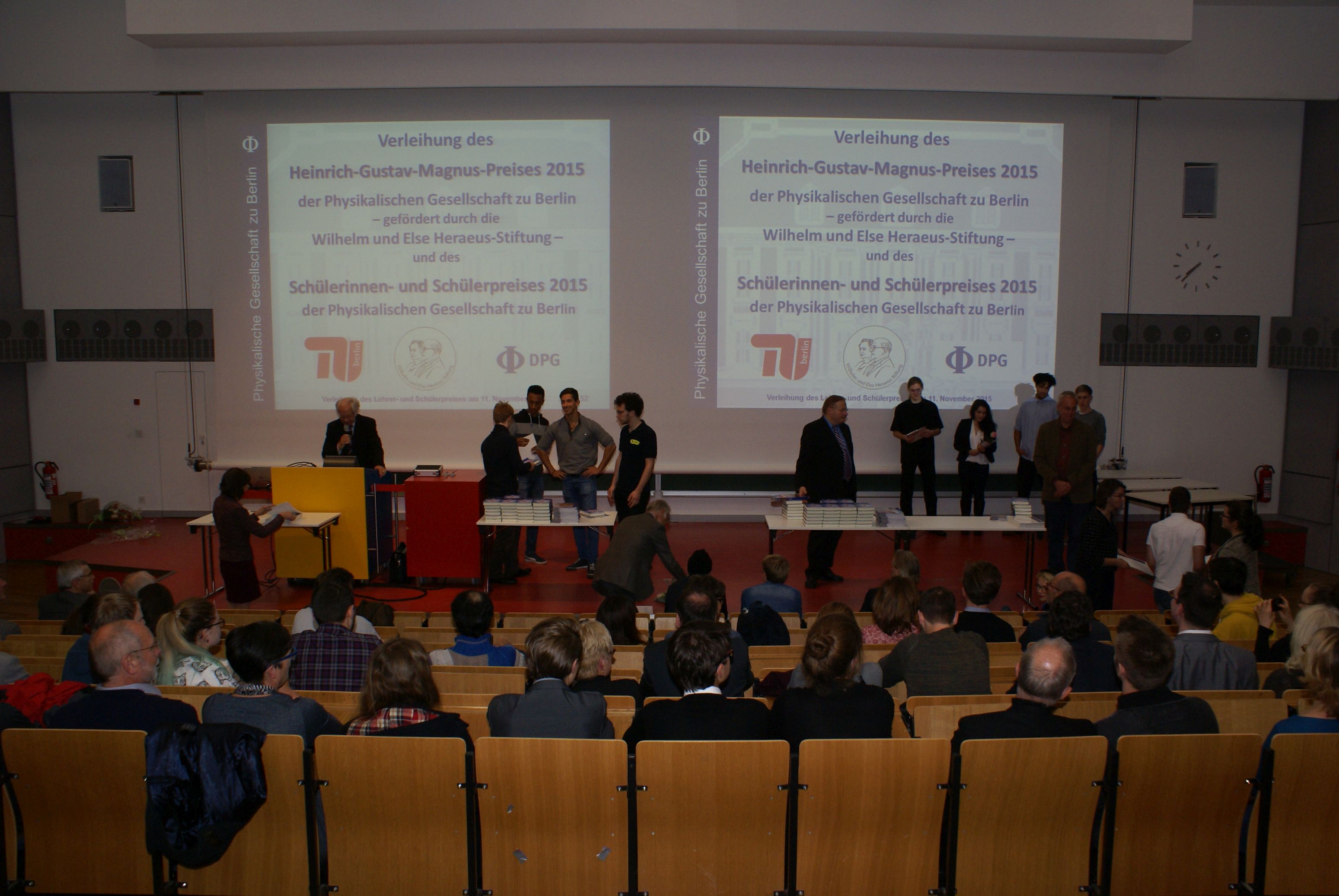 Die Preisverleihung beginnt mit der Übergabe der Urkunden, Buchpreise, DPG-Mitgliedschaften und Blumen (zum Vergrößern Bild anklicken). |